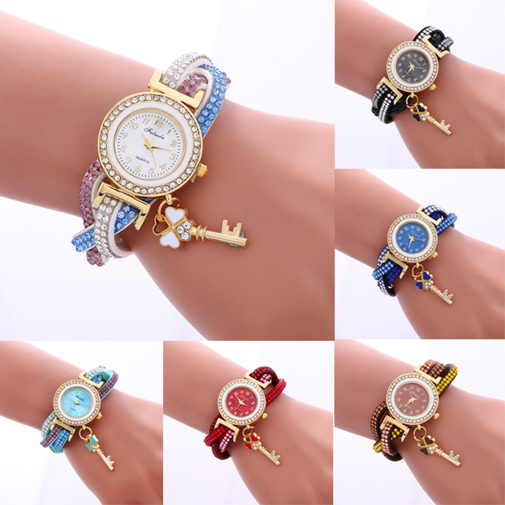 Key Pendant full Crystal Elegance Watch Wrap Around Quartz Leopard Leather Weave Watch Clock Bracelets Relogio Femininos EF8
