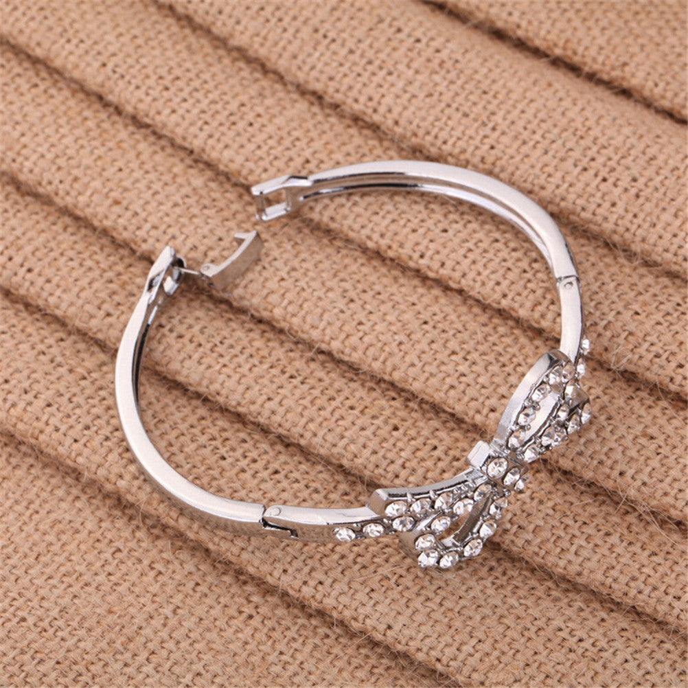 Silver Plated Pretty Bowknot Design Cuff Crystal Bangle Hollow Rhinestone Bracelet Lady Gift EF8