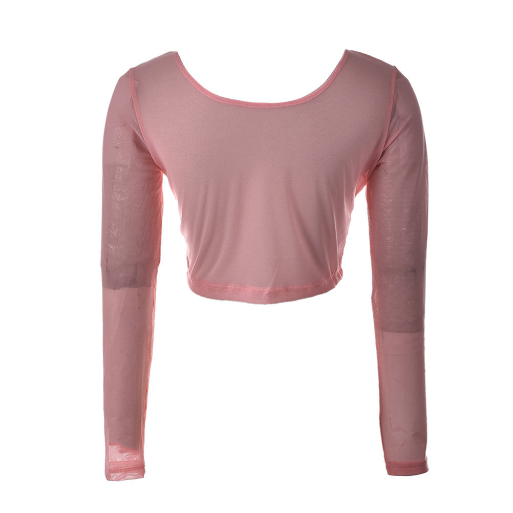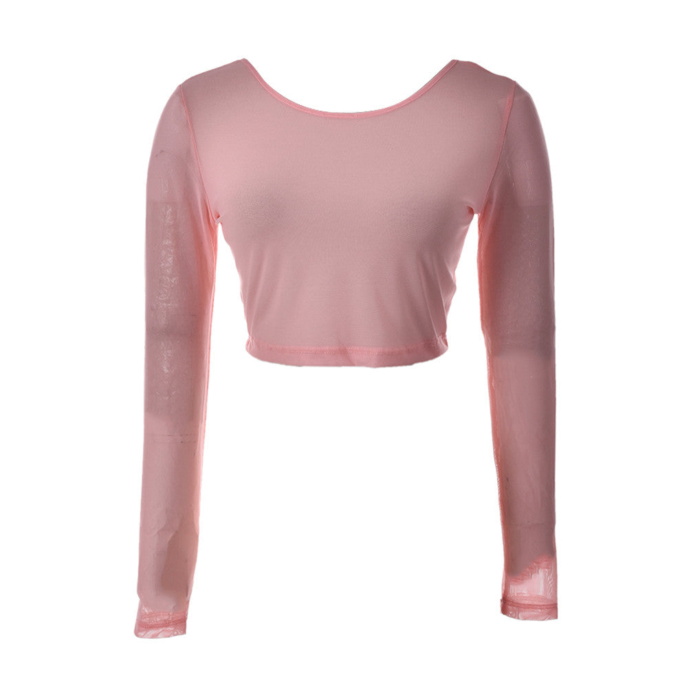 Women Sexy Slim Semi-transparent Mesh Crop Tops Girl Long Sleeve Short Tees Single Layer Mesh EF8